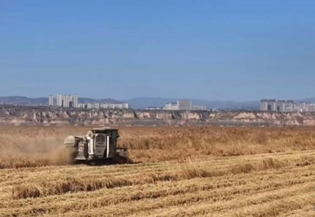 传统印象中的黄土高原,如今在隆隆的机声里呈现出“北国江南”的丰收盛景。