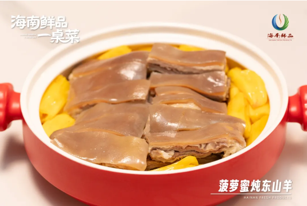 万宁东山羊肉在慢火上咕嘟出暖香,保亭菠萝蜜的果肉正慢慢化在汤里,把清甜一点点渗进每一寸肉纤维里,带皮的羊肉浸着浓而不腻的汤汁。