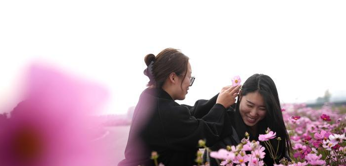 10月22日,两位女性“打卡”河北省邢台市隆尧县莲子镇镇的波斯菊花海。 郭泽鑫 摄