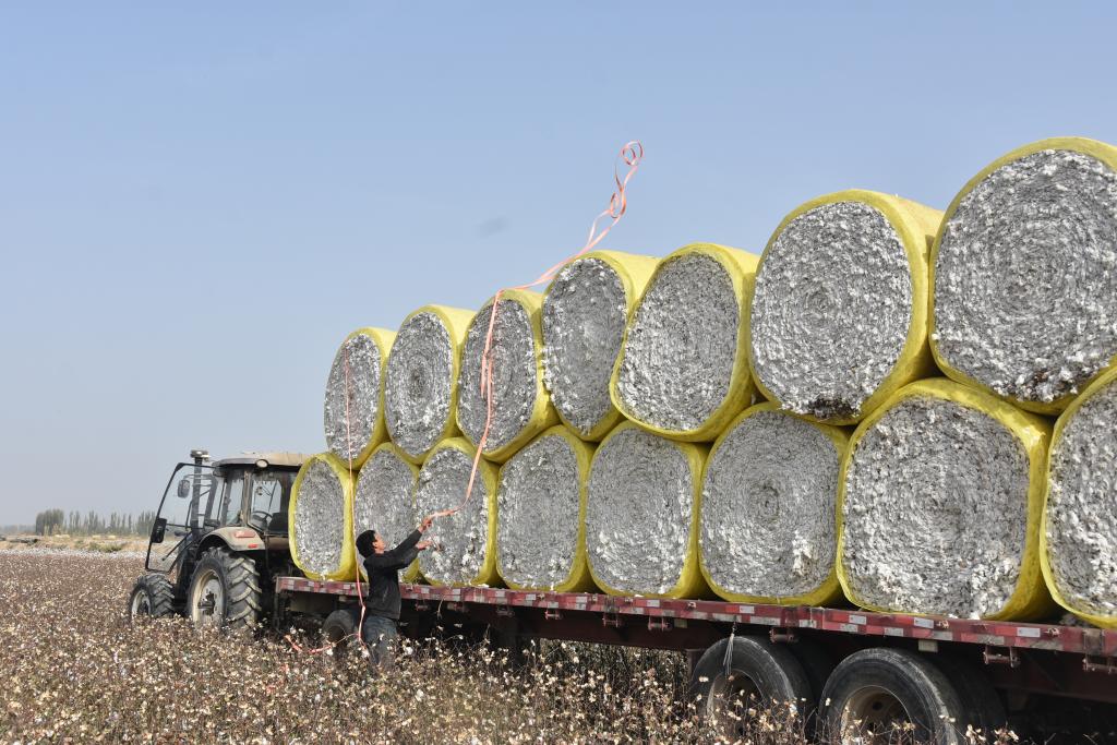 10月21日,在新疆阿克苏地区沙雅县的棉田中,棉农在固定棉花包。