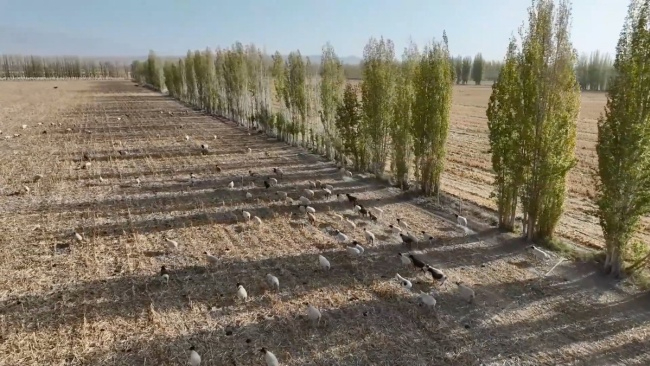 在新疆和硕县,随着农田作物采收逐步完成,残留秸秆地里迎来了一批批新的“食客”。
