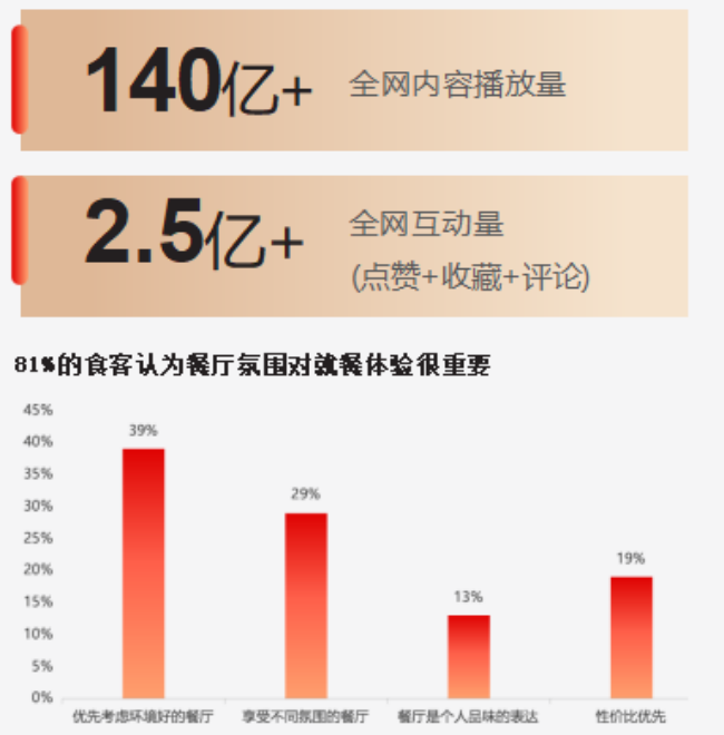 最近半年,“氛围感餐厅”相关内容全网播放量突破140亿,互动量超2.5亿次,这一数据背后是食客对餐厅氛围感期待持续提升。调研结果显示,81%的食客认为餐厅氛围对就餐体验很重要。