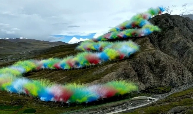 9月19日下午,西藏江孜县热龙乡喜马拉雅山脊线上,当代艺术家蔡国强点燃了烟火。刹那间,三幕烟花依次爆破,形成一条从天而降的“彩龙”。关于这场表演,主办方始祖鸟品牌和艺术家蔡国强称其为“致敬自然”,但公众看到的却是在脆弱高原生态中的一场野蛮表演。