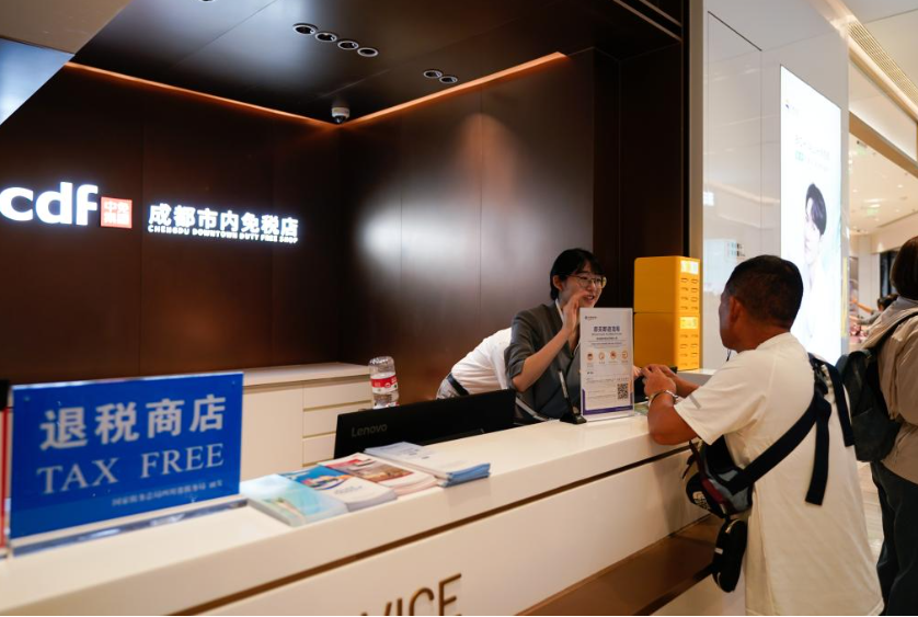 2025年9月25日,在成都市内免税店,工作人员向市民讲解退税政策。