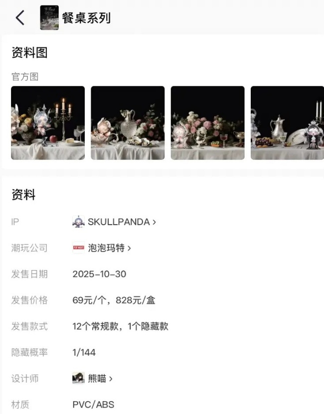 公开资料显示,“SKULLPANDA餐桌系列”盲盒于10月30日发售,12个常规款,1个隐藏款,发售价格69元/个,端盒价828元。