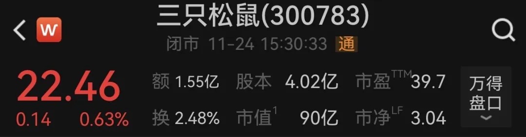 截至11月24日收盘,三只松鼠(300783.SZ)股价上涨0.63%,报22.46元,市值约90亿元。