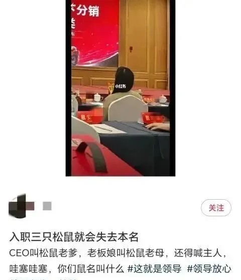 该网友发布的照片显示,在一次分销会上,每个座位都摆放着以“鼠”字开头的名牌。此外,网友还展示了三只松鼠党委名单,上面的姓名也均以“鼠”字开头。