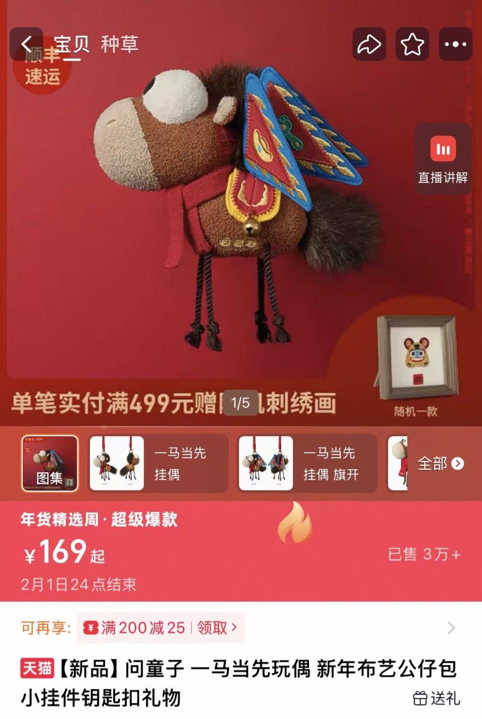1月以来,电商平台“马年”相关搜索热度持续攀升,多个马年元素产品卖出上万单的好成绩。部分产品在造型中积极融入传统文化元素,例如每年都会推出生肖玩偶的问童子,今年将传统戏剧的靠旗设计融入马年玩偶,寓意“披挂靠旗、八面威风、万事旗开得胜”,售价189元起,销量已超过3万件。生肖玩具,正通过时尚化的表达,成为今年新春消费市场的一股热流。