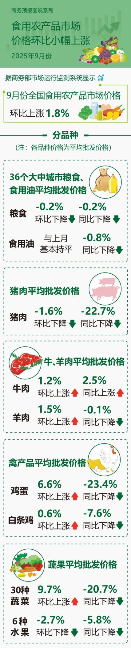 据商务部市场运行监测系统显示,9月份全国食用农产品市场价格环比上涨1.8%。