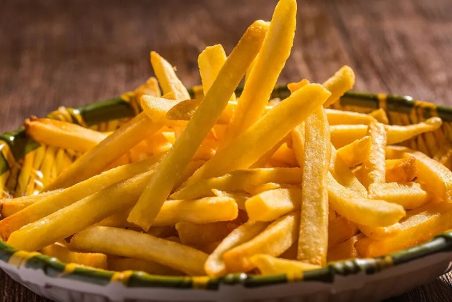但说到土豆食品,最受欢迎的当属炸薯条和类似的炸薯饼、炸土豆片,很少有人能抵御它们的诱惑。原本平淡无味的土豆。油炸后却变得分外香酥,奥秘仍然在于它的高淀粉含量。在高温的油锅里,淀粉中的糖分子发生焦糖化反应,不仅让薯条出现诱人的橙黄色泽,还会释放出香味。