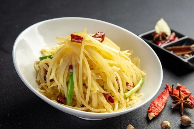 把切好的土豆丝、土豆片泡在水里,可以洗掉一部分淀粉,让口感爽脆,不要泡太久,会造成水溶性维生素的流失哦。