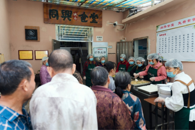 同兴食堂位于深圳龙华大和社工村,是深圳首个示范"五社联动"社区治理机制的社工村。食堂刚落地时,来这里的多是附近的老人和低收入群体。后来,不少常来用餐的居民慢慢成了“半个主人”——提前到场帮忙整理桌椅、分配餐食。发起机构之一广州市阳光青藤爱心促进会成立了社区志愿者服务队,累计参与的志愿者已有数百人次,其中很多就是本社区的活力老人、宝妈和大学生。