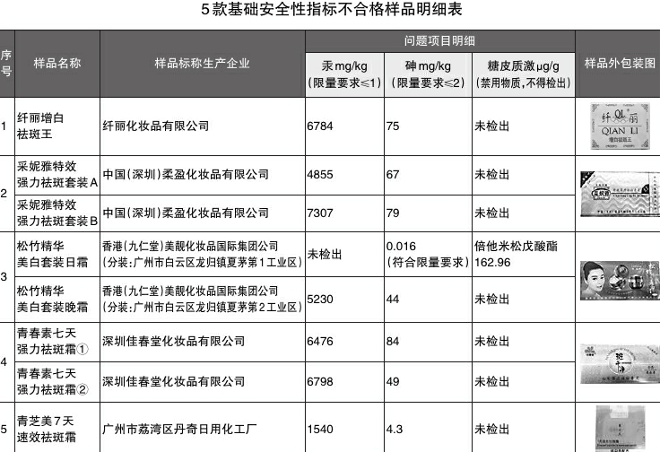 本次比较试验中,共有5批次样品重金属和糖皮质激素(基础安全性指标)出现异常。5批次样品均重金属超标,其中3批次样品为套装,3批次套装样品中有2批次套装的4个样品均检出重金属超标,分别为标称中国(深圳)柔盈化妆品有限公司生产的采妮雅特效强力祛斑套装、标称深圳佳春堂化妆品有限公司生产的青春素七天强力祛斑霜,1批次套装的日霜检出禁用激素、晚霜检出重金属超标,为标称香港(九仁堂)美靓化妆品国际集团公司(分装:广州市白云区龙归镇夏茅第2工业区)生产的松竹精华美白套装。