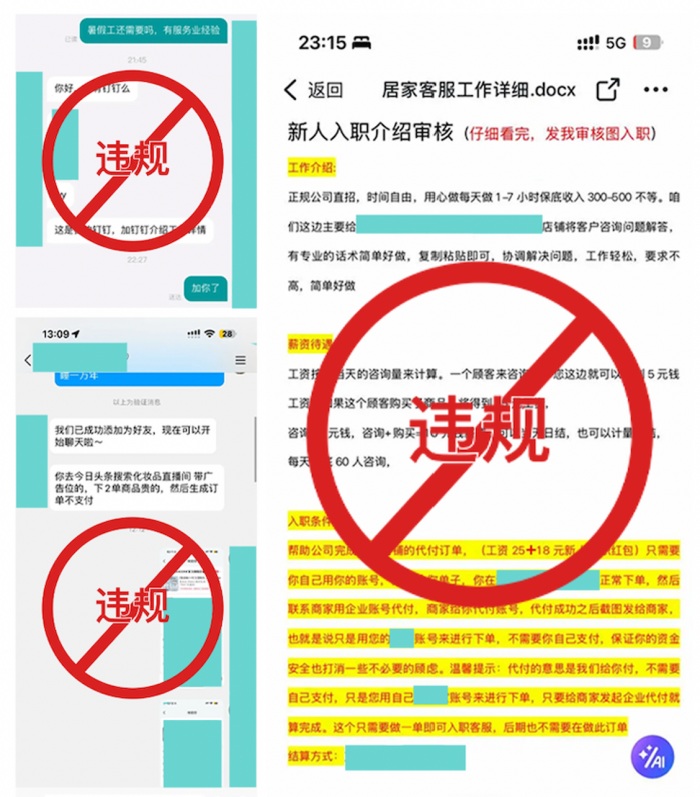 当前黑灰产违法行为呈现出“隐蔽化”“职业化分工”的特征。体现为,在社交网络上招募“工具人”,在招聘平台上获取线索,转到第三方软件沟通,再到不明APP或电商平台上进行刷单或开展其他诈骗活动。