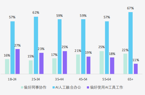 65岁及以上的职场人选择“仅使用AI工具工作”的比例仅为11%。对他们而言,面对面沟通带来的信任与情感连接,是AI难以替代的工作价值。