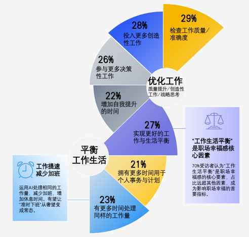 27%的职场人借助AI实现了更好的工作生活平衡,21%的职场人将节省的时间用于个人事务(如健康管理、家庭陪伴)。