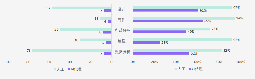 【数值越高成功率越高】人类在写作(94%)与设计(92%)任务中成功率最高。