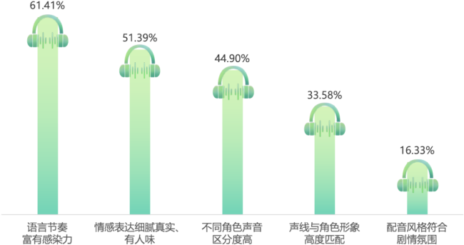 用户对优质声音的诉求有着清晰且高度一致的共识,这种共识贯穿于从影视配音到日常音频内容的全场景消费体验中。艾媒咨询2025年发布的《中国声音经济消费趋势报告》表明,在影视、广播剧等内容的配音评价维度中,优质配音的核心KPI高度聚焦于三大维度:“语言节奏富有感染力”以61.41%的占比位居首位; “情感表达细腻真实、有人情味儿”紧随其后,占比达51.39%;“不同角色声音区分度高、易于辨识”则以44.90%的占比成为第三大核心诉求。