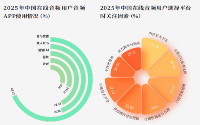 用户决策时最关注内容丰富度(36.16%),音质与更新速度紧随其后,显示其对内容“质与量”的双重追求。个性化推荐、功能体验及价格合理性等综合因素也构成平台选择的重要依据。