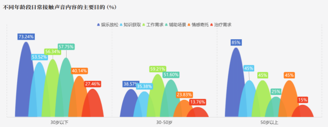 从年龄维度看,30岁以下的年轻人以“娱乐放松”为核心需求,娱乐播客、流行音乐等备受青睐;30至50岁的职场人更趋“务实”,将声音视为工作辅助工具,59.21%的用户对会议录音、专业音频制作等功能性内容需求强烈;50岁以上人群则回归“陪伴与疗愈”,情感电台、文学类有声书及白噪音、自然声等疗愈音乐,成为日常精神慰藉的重要载体。
