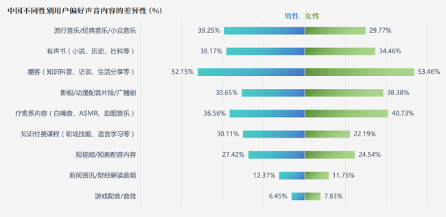 性别差异同样显著:超五成男性用户通过播客实现“自我充电”,偏好流行音乐与知识课程,兼顾实用与放松;过半女性用户热衷播客,超四成青睐疗愈类内容,对她们而言,声音不仅是信息媒介,更是心灵滋养的重要渠道。
