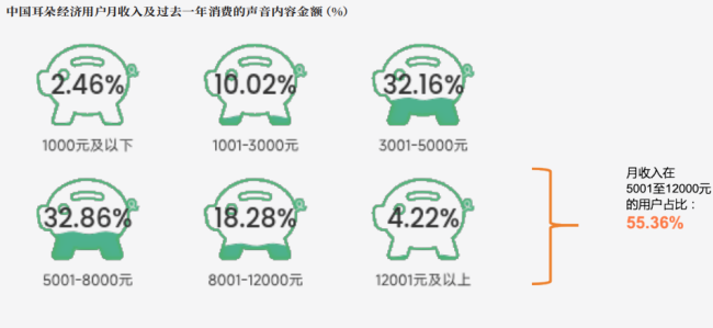 从收入结构来看,月收入在5001至12000元的用户合计占比超50%,构成了声音消费的主流人群,他们不仅消费能力稳定,付费意愿也十分突出——35.85%的用户过去一年在声音内容上消费101至300元,付费习惯已逐步养成。2025年国内主要音频平台的用户订阅付费和直播打赏收入将达128.30亿元,占总收入的68%。