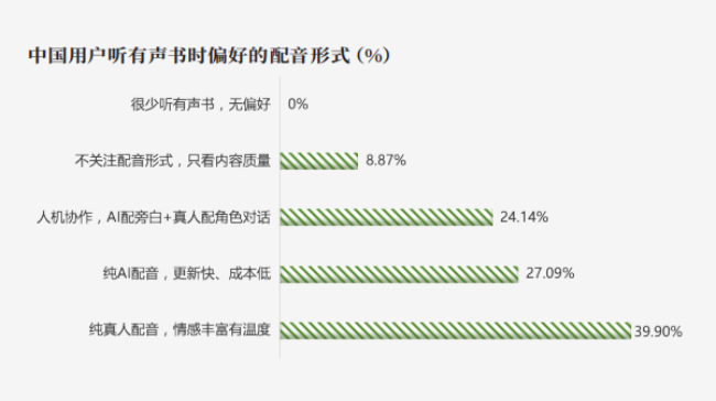 此外,AI技术的介入虽带来了“灵活多变”的优势,50.09%的用户对AI配音“比较接受”,但行业内AI配音滥 用问题突出,不仅 质量堪忧,还存在侵犯真人权益、价格虚高性价比低等痛点。尤其在有声书领域,39.90%的用户首选“纯真人配音”,因为AI再智能,也难以替代真人声音中蕴含的情感深度。