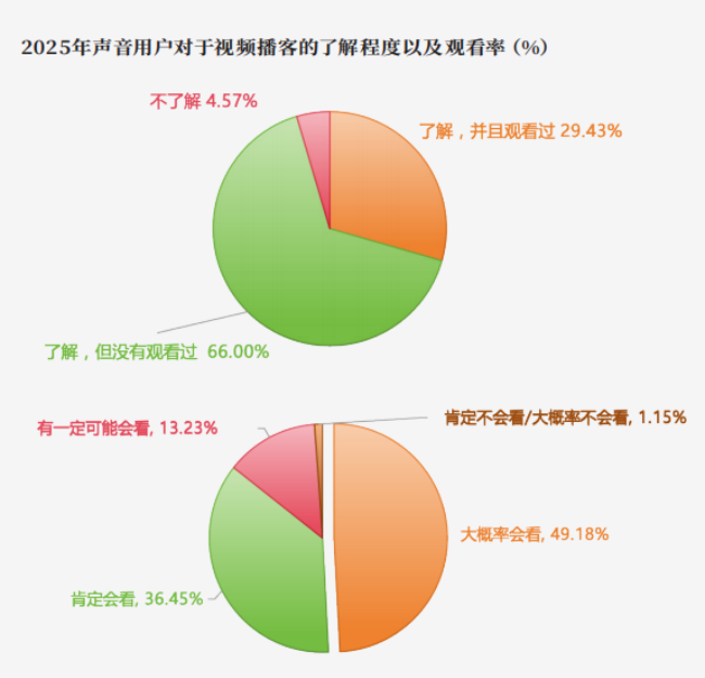 益普索2025年播客行业报告显示,多达95.4 3%的受访者表示曾通过社 交 媒体、短视频平台或朋友推荐了解过视频 播客,其中29.43%的受访者已养成稳定的观看习惯。更值得关注的是,在“了解但尚未观看”的潜在用户群体中,85.63%的受访者明确表达了尝试观看的意愿。这一规模可观的潜在用户群体,为视频播客的发展开辟了广阔的空间,也为耳朵经济注入了兼具传播力与感染力的全新活力。