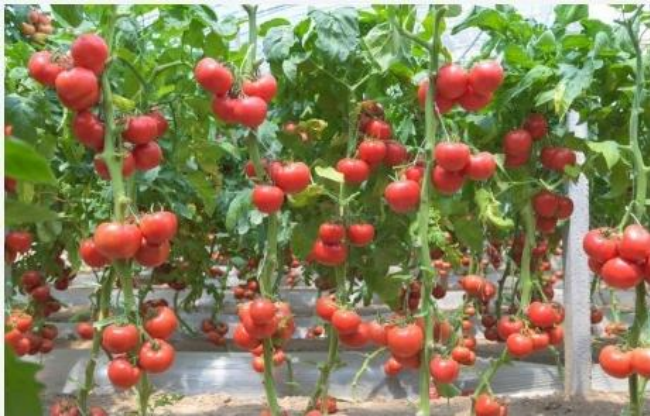 温室里的番茄藤挂满红果