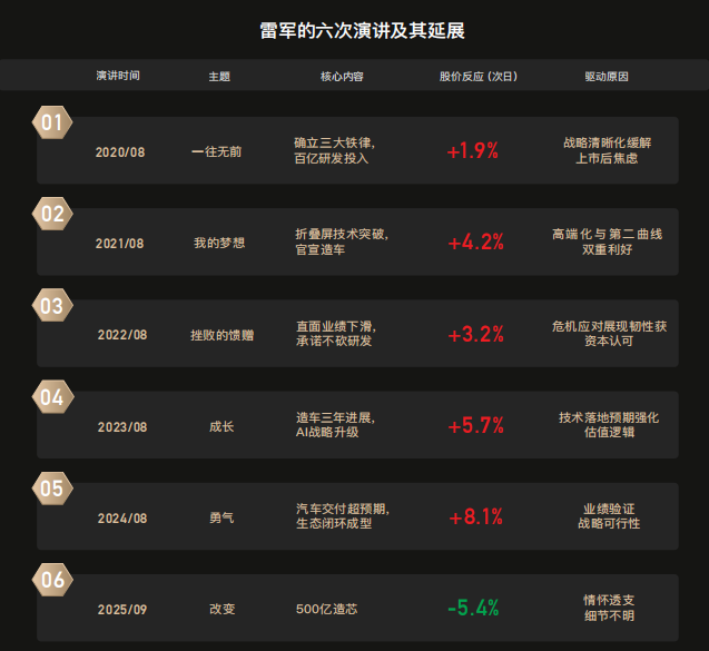 回溯雷军年度演讲的六年轨迹,其个人IP与小米品牌的绑定曾是资本市场的情绪催化剂。