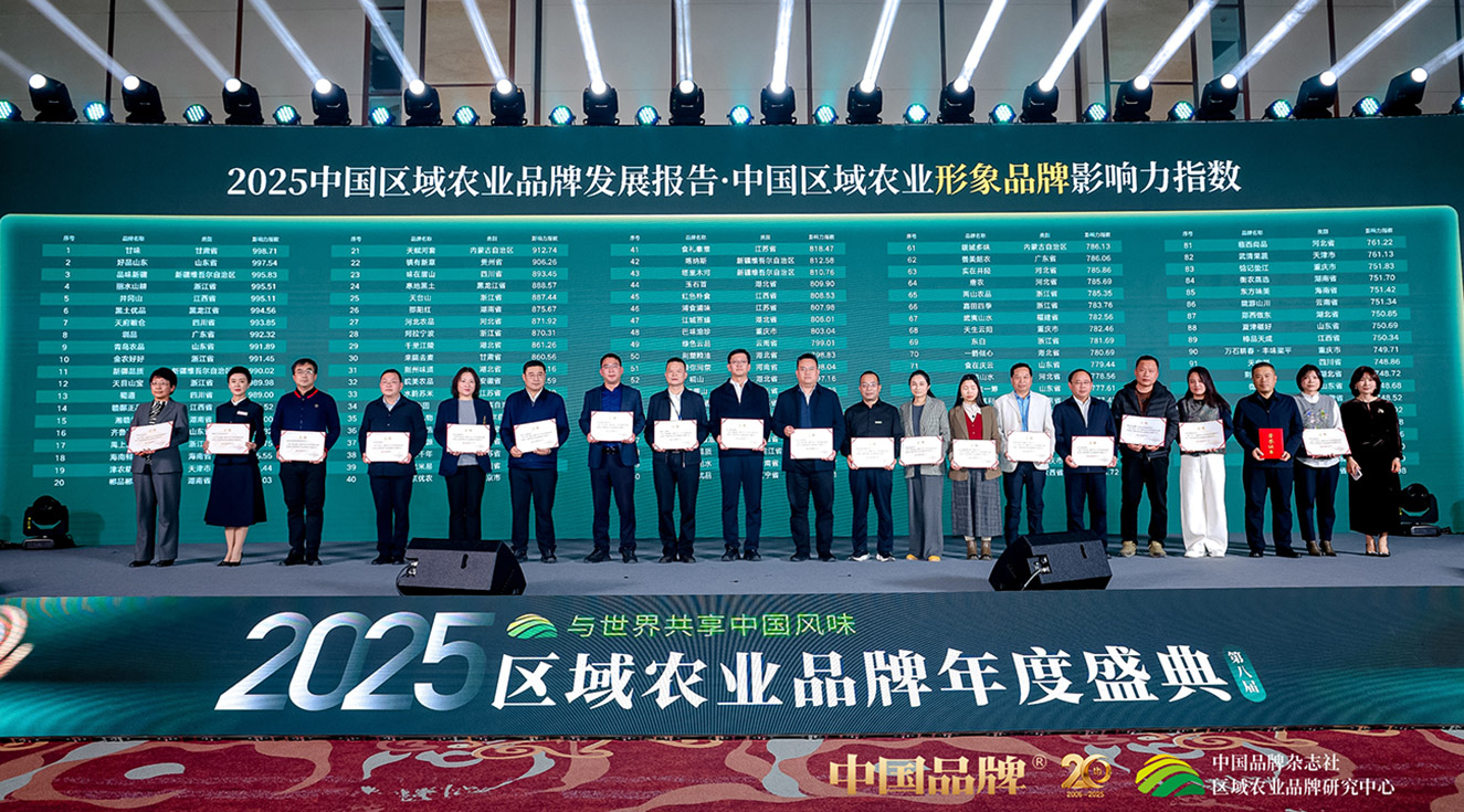 12月20日,“2025中国区域农业品牌发展报告·中国区域农业形象品牌影响力指数”在“2025区域农业品牌年度盛典”上揭晓。该指数由《中国品牌》杂志社区域农业品牌研究中心基于全网及公开数据测算形成,是《2025中国区域农业品牌发展报告》的重要组成部分。