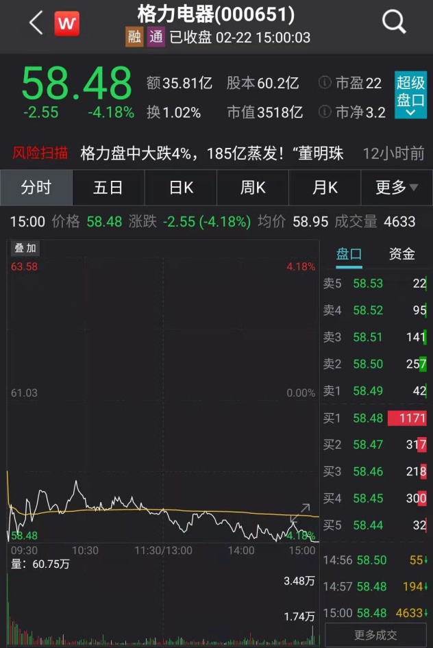 中新经纬记者注意到,2月22日,格力电器股价收跌4.18%,报58.48元/股,总市值为3518亿元。