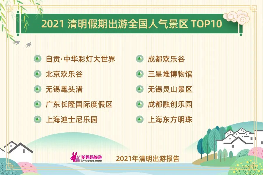 《报告》显示,清明期间,以踏青赏花、感受优秀文化等为主要目的,郊野公园、山水名胜、文化古迹、美丽乡村等类景区人气火爆。同时,得益于宜人气候,以上海迪士尼乐园、广东长隆度假区、北京欢乐谷等为代表的主题乐园、动物园,也备受情侣、亲子家庭青睐。