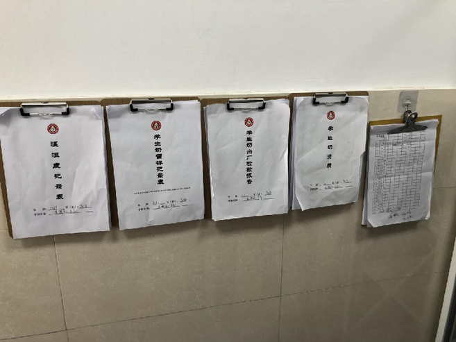 在这些学校的储藏室里,学生奶都按照产品底层垫托板、四周离墙、离地15cm以上等严格要求摆放储存。学校的墙上还挂着关于学生奶的储存、领取与分发、不适反应处理流程等规章制度。