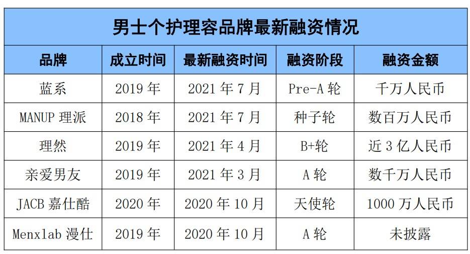 而在蓝系之前,“理然”已是男士美妆赛道里的明星。四月,理然获得来自Tiger Global、哔哩哔哩、五源资本和红点中国等投资者近3亿元的B+轮融资,这是它在成立一年多里的第六轮融资。除了理然和蓝系,“dearBOYfriend亲爱男友”、“Menxlab曼仕”和JACB嘉仕酷等新锐男士美妆品牌也在近期获得少则千万,多则上亿的投资。
