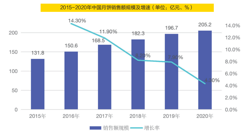 2020年中国月饼市场销售规模已超200亿元,随着疫情防控常态化、国民对传统节日重视提高,走亲访友的需求将继续复苏,预计2021年中国月饼销售规模将达218亿元。