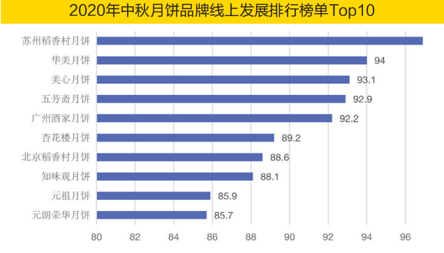 艾媒金榜《2020年中秋月饼品牌线上发展排行榜单》显示,本次上榜的月饼品牌主要以南方月饼品牌为主。其中苏州稻香村月饼以96.9的金榜指数摘得桂冠,华美月饼、美心月饼分别以94.0、93.1的金榜指数位列第二、第三。