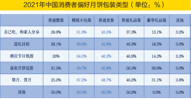 据艾媒咨询2021年6月调研结果,54.7%的中国消费者偏好精致小包装的月饼,其次是普通盒装月饼。不管在月饼自用还是送礼的消费场景,精致小包装月饼都是消费者的首选,这反映了消费者对月饼包装“颜值”的关注度提升,精致、轻量的月饼更受欢迎。