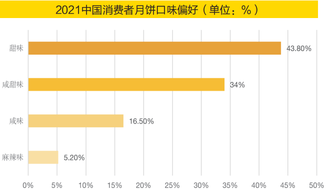 从月饼的口味来看,艾媒咨询2021年6月数据显示,甜味月饼依然是主流,占比超过4成;咸甜味月饼的市场欢迎度也比较高,占比34%。由于地域因素,中国北方地区的消费者偏好甜口为主,江浙沪地区以咸口为主,南方地区则咸甜通吃。