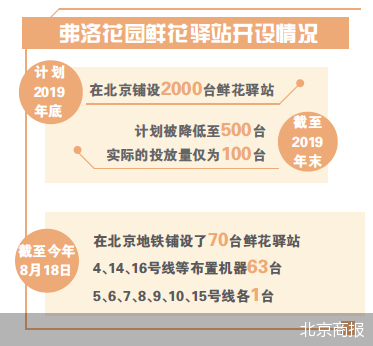 与此同时,弗洛花园提供的数据显示,截至今年8月18日,弗洛花园在北京地铁铺设了70台鲜花驿站,其中4、14、16号线等布置机器63台 ,5、6、7、8、9、10、15号线各1台。可见,当前的70台低于2019年末实际投放的100台数量。
