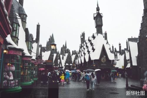 游客在北京环球影城主题公园哈利·波特的魔法世界主题景区游览。