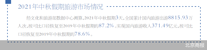 9月21日,文旅部发布2021年中秋节假期文化和旅游市场情况。综合各地文化和旅游部门、通信运营商、线上旅行服务商数据,经文化和旅游部数据中心测算,2021年中秋节假期3天,全国累计国内旅游8815.93万人次,按可比口径恢复至2019年中秋假期的87.2%。实现国内旅游收入371.49亿元,按可比口径恢复至2019年中秋假期的78.6%。