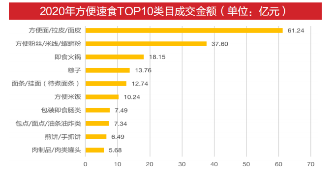 淘宝天猫全网数据显示,2020年的速食市场,用户在“方便面/拉面/面皮”、“方便粉丝/米线/螺蛳粉”和“即食火锅”三大品类上偏好明显。其中,经典老牌商品“方便面/拉面/面皮”品类总成交额约为61.24亿元,占比28.75%,为该行业领跑类目。