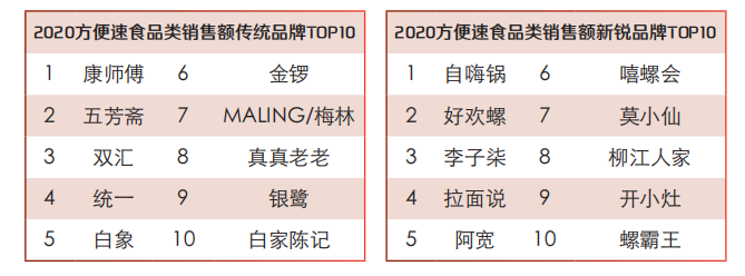 第一财经商业中心消费大数据显示,2020年最受欢迎的传统速食品牌是康师傅,最受欢迎的新锐速食品牌是自嗨锅。从榜单中可以看到,消费者已经把自嗨锅和自热火锅品类划上了等号;说到螺蛳粉,好欢螺成为消费者的首选;在面食速食赛道中,拉面说、空刻和阿宽突出重围。
