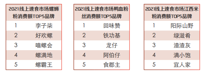 第一财经商业数据中心消费大数据显示,2020年6月-2021年5月,线上速食市场地域美食的消费额增长迅速。其中以鸭血粉丝、江西米粉等地域特色美食增长最快,螺蛳粉当前消费额占比最高,以好欢螺、螺霸王为代表的广西螺蛳粉品牌迅速成长为速食行业中的代表品牌。