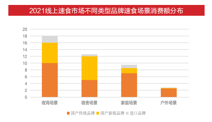 《2021速食青年消费趋势报告》显示,“夜宵”线上搜索量平稳上升,新老品牌积极拓展速食消费场景,夜宵场景是速食市场中最多被提及的食用场景,其次是宿舍场景和家庭场景。