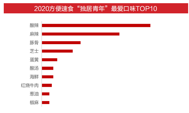 方便速食领域“一人食”概念持续走红,独居青年为“一人食”的主力人群。《2021方便速食行业洞察报告》显示,独居青年对于速食口味的选择较为专一,最爱的美食口味是酸辣及麻辣。
