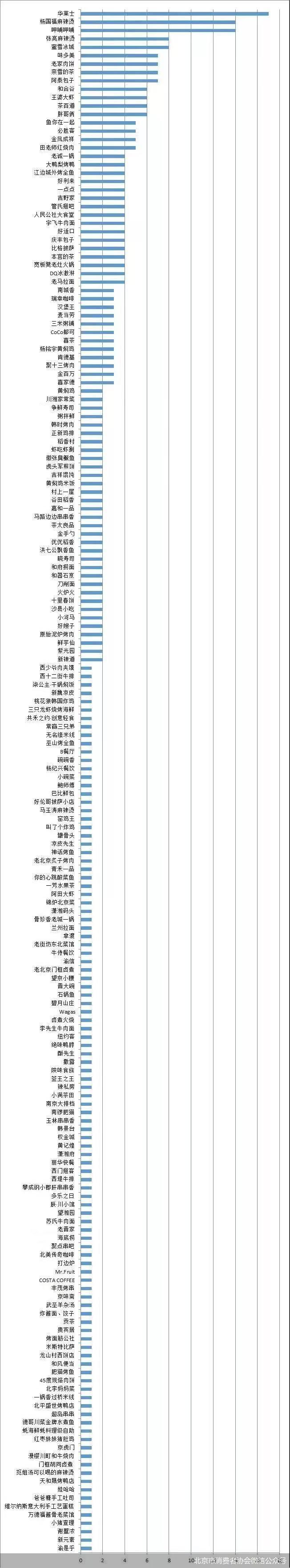 从北京市消协通过上述检查情况整理的存在食品安全问题的餐饮企业名单来看,华莱士出现问题的餐厅数量最多,共有17家,杨国福麻辣烫、呷哺呷哺、张亮麻辣烫、蜜雪冰城等品牌紧排其后。