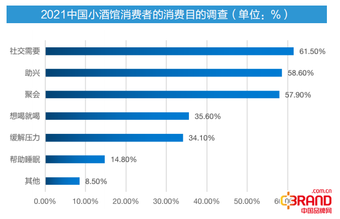 根据NCBD进行的消费者行为洞察显示,61.5%的消费者去小酒馆是为了社交需要,小酒馆的社交属性愈发明显。除此之外,58.6%的消费者是为了助兴,34.1%的消费者是为了缓解压力。