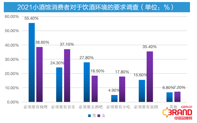 NCBD调研数据显示,55.4%的男性表示喝酒必须要有烧烤,女性则更注重音乐与氛围,37.1%的女性受访者表示必须要有音乐,超过1/3的女性表示必须要有氛围。